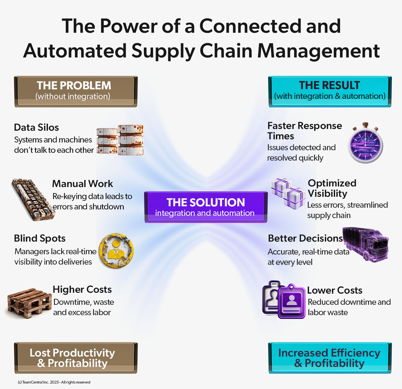 When your data is transparent, integrated, and automated, you get fewer surprises, faster decisions, and better service. Central (TeamCentral’s no-code iPaaS) + CORBI Enterprise AI make that real.